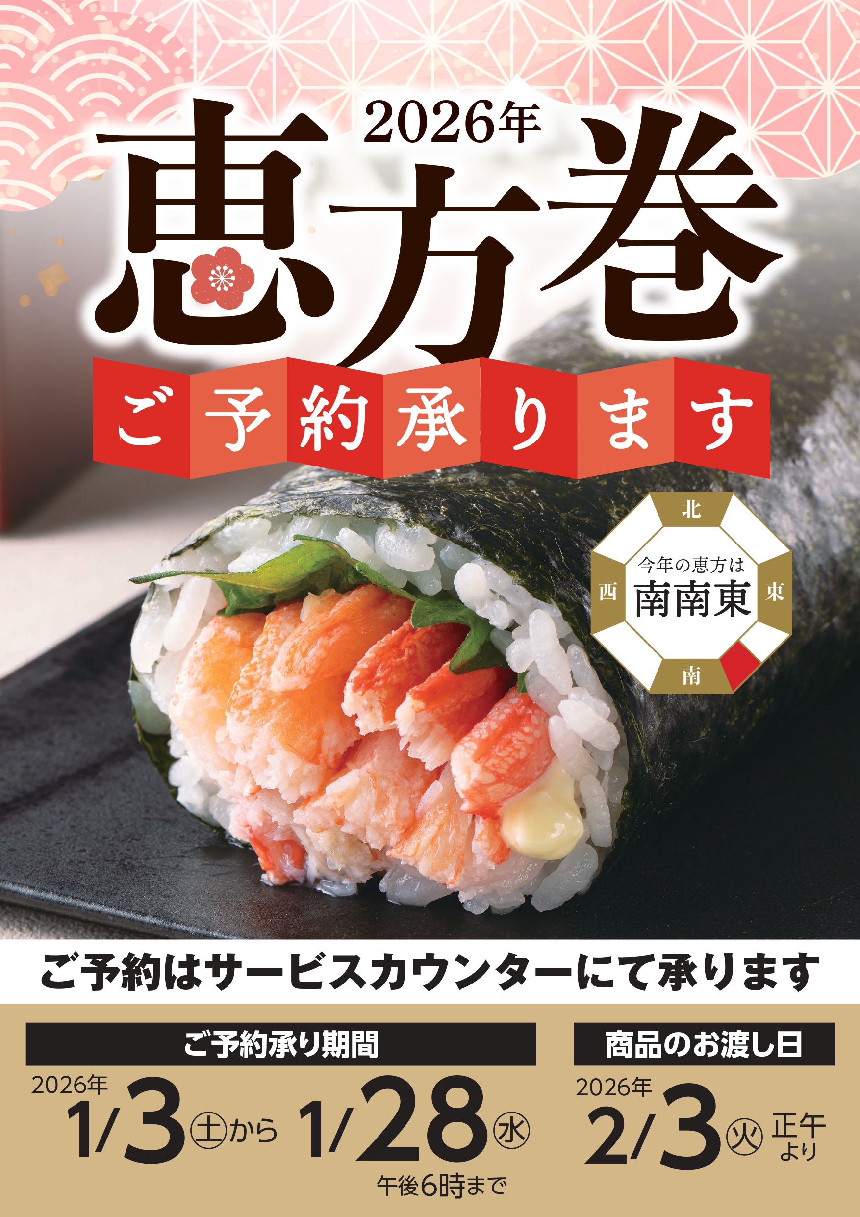 • 2026年恵方巻ご予約承ります 承りは1月28日(水)午後6時まで
